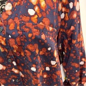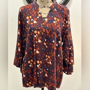 NWT Blue with rust & white spots button front top V-neck Soft wash Raglan 3/4 bell sleeve Front pocket Shirttail hem (ragged edges) No stretch ( but oversized)