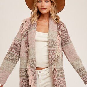 New Western Fringe Sweater Coat Southwest Boho Long Cardigan, Cowichan Vtg