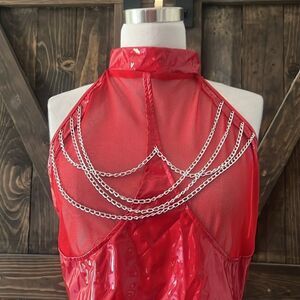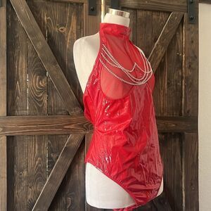 New Wet Look Patent Leather Red Bodysuit Zipper Catsuit Open Crotch Ling…