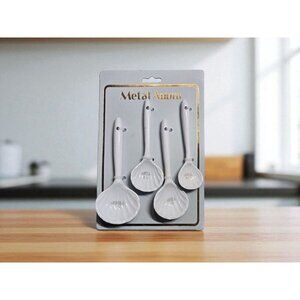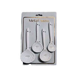 This product is a set of four measuring spoons in the shape of sea shells, made of ceramic and featuring measurement markings. The set includes a hanger for easy storage. The white color and shell pattern make it a unique and nautical-themed addition to any kitchen. Handmade in the United States, this original set is perfect for a birthday gift, especially for someone who loves sea shells and fish. The set includes tablespoon, teaspoon, 1/2 teaspoon, and 1/4 teaspoon sizes for universal food compatibility.