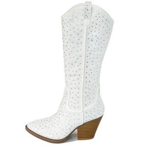 New White Blingy Rhinestone Knee High Cowboy Boots