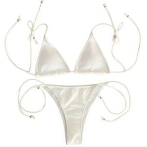New White Ribbed Tie Shoulder Tie Side Triangle Bikini Set Swimsuit Size L