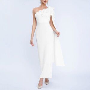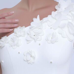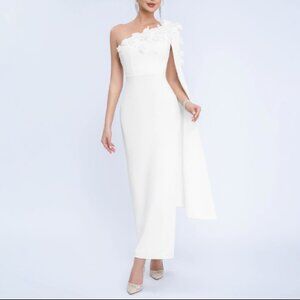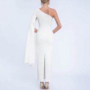 New White Satin Flower Cape Sheath Evening Reception Gown Emphasizes