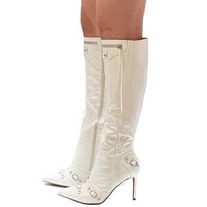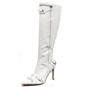New White Silver Stud Tassel Pointed Toe Stiletto Heel Knee High Boots