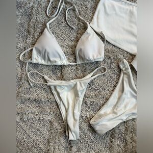 All brand new. Each suit has sanitary lining. 2 size small white bikinis, both tops have light padding. 1 white, one shoulder crop included.
