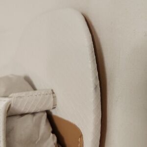 These are new shoes, however, packaging was taken off of one shoe to try on. The shoe with the packaging has a few scuff marks, as shown in last 2 pictures. Price has been adjusted accordingly. The heels in these shoes are so neat! Triangle shaped! The straps wrap around the ankle and buckle. Feel free to ask any questions!