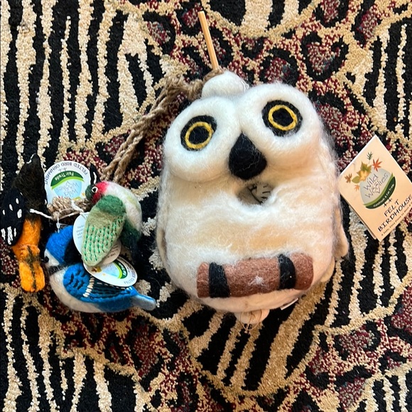 Charming wool owl birdhouse with felt bird decorations. Features vibrant colors and intricate details.