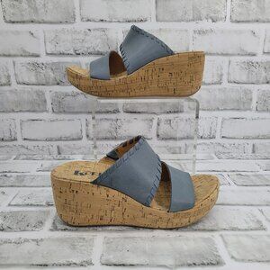 New, with box. Kendri wedge sandals by Korks. Beautiful dusty blue color (denim), leather upper. Women's size 7. There are some markings on the box.