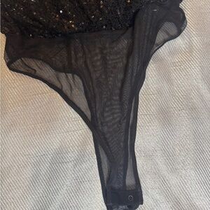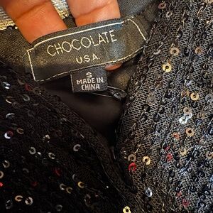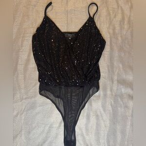 *New With Tag* Chocolate Women’s Black Sequin Strappy Bodysuit, Sz S, Orig. $38 is in excellent condition.