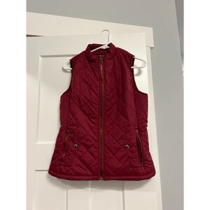 Beautiful quilted vest, new with tags, never worn, size small. Beautiful wine color with a satin-like polyester inner lining. Zipper pockets on each side. Size small.