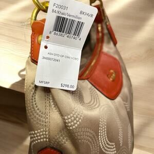 This New With Tags Coach F20031 Ashley Dotted OP Art Convertible Hobo Bag from 2012 is such a refined take on the classic Coach hobo bag! Featuring sateen in the Khaki/Vermillion colorway with a dotted OP Art design and gold hardware, this bag is both super stylish and functional with a removable strap for hand, shoulder or crossbody wear. Great colors for fall/winter and if you love and appreciate Coach quality and style, this is a must have for your collection!