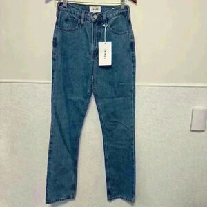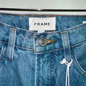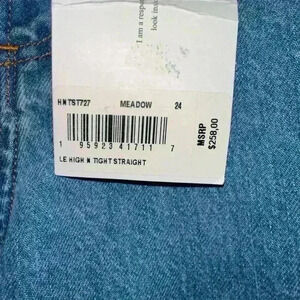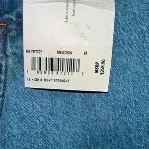 These are new with tags Frame Le High 'N Tight Straight jeans in the Meadow wash. They are a size 24 and have a high rise and straight leg. The jeans are made of 100% cotton and have a classic blue denim color. They feature a button fly and five pockets. The jeans are in excellent condition and have no visible imperfections. They come with the original tags and packaging. MSRP: 258