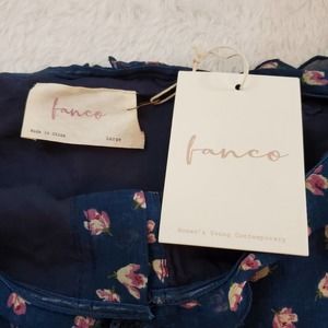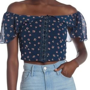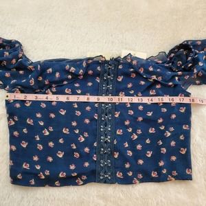 So cute! Fanco Large Navy Floral Print Off The Shoulder Blouse with Flutter Sleeves. Front hook closure, cropped top with elasticized hem. See pictures for details and measurements.