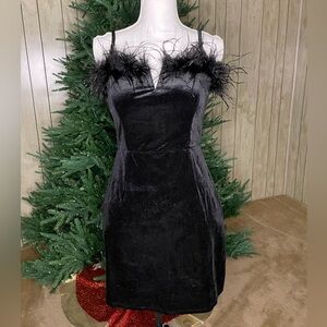 New With Tags Francesca’s Black Velvet Mini Dress With A Feathery Neckline