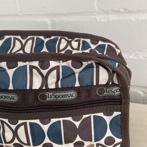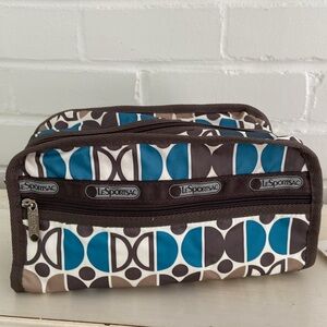 Chic LeSportsac pouch with a circle pattern. Features blue, brown, and white colors. Never used-tags still attached. This particular pouch is hard to find now. Please see all pictures for a better detailed description.