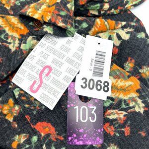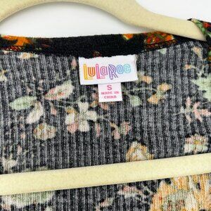 New With Tags LuLaRoe Sarah Cardigan Duster Small (6-8), orange floral print on a charcoal background. The Sarah cardigan features a cropped long sleeve for easy movement, a flattering silhouette and pockets!
