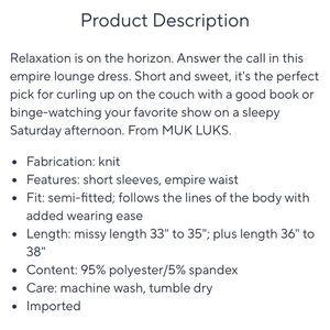 New With Tags MUK LUKS Cloud Knit Short Sleeve Empire Lounge Dress Black, Large