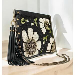 This New With Tags Mary Frances Sunshine & Daisies bag is just exquisite! Featuring a hand beaded front with sculptural daisies and leaves in black, green white and gold and a black leather back. This bag is perfect for the daisy lover or when you want to make a statement! Can be worn as a crossbody or shoulder bag.