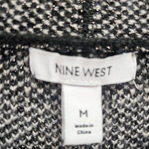 This new what the original sales tag retail $60 from Kohl's. Nine West, long black ladies cardigan, is a 50% blend of recycled polyester. 32% polyester and 18% metallic. Wash inside out cold with light colors. Reshape and dry flat. Size medium. Length from neck to him. 36 inches long Sleeve length. 25 inches in length. Condition new with tags. Non smoking pet free home.