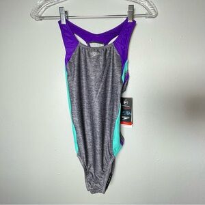 New With Tags Speedo Girls One Piece Racerback Swimsuit Size 14 Gray Purple Aqua
