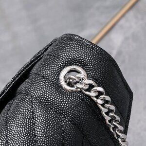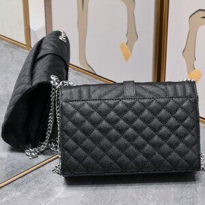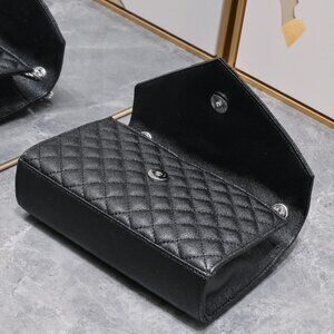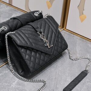"Brand new Saint Laurent large envelope flap bag in diamond-quilted matelassé grain de poudre embossed leather with YSL logo, silver-tone hardware, and magnetic closure. Interior features pockets. It has sliding chain and leather shoulder straps, doubled 11.8"" drop and unfolded 20.4"" drop. Interior is grosgrain lining with one slot pocket.