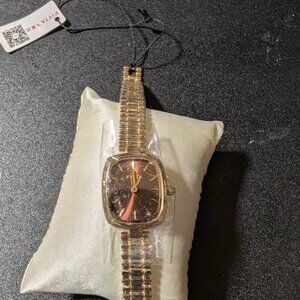 Step back in time with this beautiful, never-worn small gold watch! It features a classic rectangular "radio" style case that's both sophisticated and timeless. Still has the protective plastic on the wristband and the face cover (removed only for photos and immediately replaced).