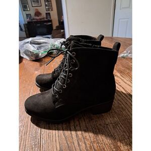 new without tags boots, never worn ankle boots, womens size 7 boots, vjh black faux suede, lace up boots, chunky heel boots, stacked heel booties, side zip ankle boots, casual boots, winter boots, fall fashion boots, dressy ankle boots