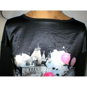 Blugirl Folies by Blumarine Beautiful dress! Great with heels, boots, sandals, or sneakers! I soooooo wish this were my size! London is one the front with crystal accents Logo is below graphics Balloons Big Ben Long sleeves with ruching at the end fun! Size 10 in US Micro modal and Acetate blend (think stretch satin)