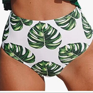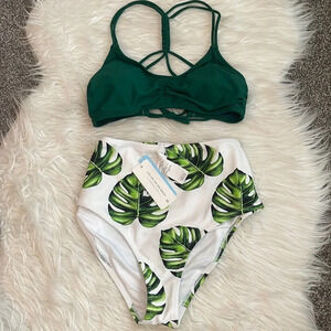 NWT. Women’s. White bottoms with green leaves bikini bottoms. High waist. Green strappy braid bikini top. Built in padding. Adjustable back straps. Size Small.