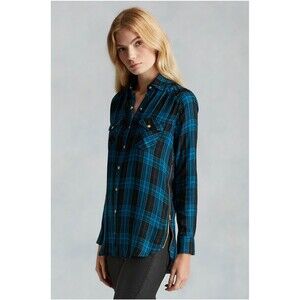 New Womens Designer True Religion S Plaid Top Logo Black Aqua Blue NWT Tunic Zip