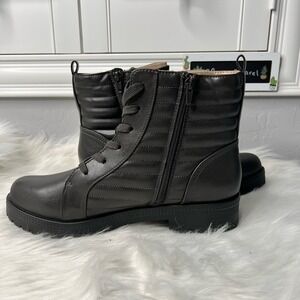 Rain, snow, or shine. This sustainable, water-resistant combat boot always looks on-trend. Water-resistant faux leather upper with a round toe, inside zipper, back pull tab, puffed and padded detailing, and substantial lug sole. Toe box, heel counter, linings, sock foam, and outsole made with recycled materials.