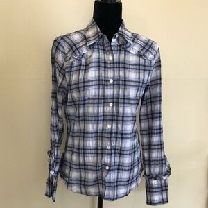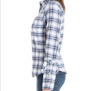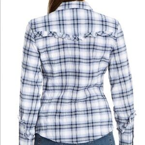 This long sleeve button-down shirt is a perfect addition to any fall look. Ruffled details adorn the shoulders, back and cuffs of this crinkled cotton blend shirt. Wear with jeans for off-duty dressing. Max Studio.