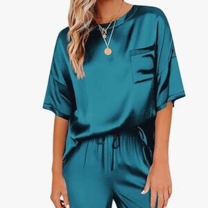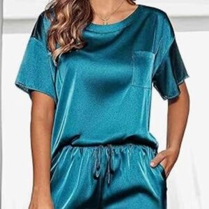 New Women's Satin Silky Pajama Loungewear Set Short Sleeve Top Pant Green Large