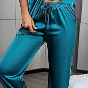 New Women's Satin Silky Pajama Loungewear Set is so versatile that you can separate the pieces and wear them out, sleep in them, have a girls weekend pajama party or just relax around the house. Super lightweight and comfortable. The two-piece comes with a pullover short sleeve top and long pants.