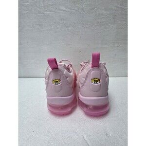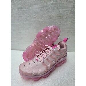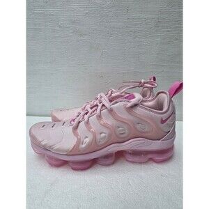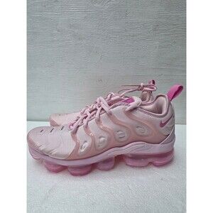 The product is a pair of Women's Size 10 Nike Air Vapormax Plus Running Shoes in Pink Foam color. These sneakers feature a lace-up closure, low-top shoe shaft style, standard shoe width, cushioned comfort, and a solid pink color with logo accents. They are designed for running and jogging, with a mesh upper material and foam insole for added breathability and support. The Nike Air Vapormax Plus model offers a colorful and sporty theme, perfect for athletic activities. NO BOX [4D]
