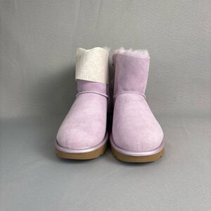 These new womens, take your breath away, sold out rare-find, UGG Australia Mini Bailey Bow II Metallic LRFG (Lavender Fog) boots style #101932, come with bows lining the heel and in a size 8 US, 39/EU, and 6/UK. They are new and have been stored in their box covered with tissue paper, preserving their color. They are a gorgeous, pastel purple with bright bows and heels creating a contrasting, pop effect. These womens Uggs are a gorgeous feminine, dopamine, feel good, girlhood, glam, head-turning, statement pair of boots! They are great for a gift or present to someone special including yourself! Splurge today and grab your coquette, festival, heart-stopping boots! They are sold out and discontinued, so no longer made in this color and style. They are extremely hard to find!! I search throughout the year to find rare Uggs like this! Don't miss this opportunity!!