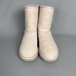 Women's light pink, Seashell UGG Classic Short boots in size 9. The are lambskin or sheepskin suede leather with shearling lining and wool inserts for ultimate comfort and warmth. They are sold out in this color! These UGG boots are perfect for any occasion, whether traveling, comfortable commuting, going to school, just running errands, festival party going, or a surfer chic trying to keep warm after a day in the water. They range from coquette, pastel, feminine, bohemian, boho, festival, Lana Del Rey, to Malibu vibe. Get your fabulous, women's Shell Pink Ugg boots today, while you still can! They are sold out in stores. Style # 1016223