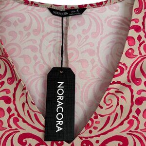New Women's V-Neck A-Line Maxi Dress Pink & Beige Pattern Small Short Sleeve