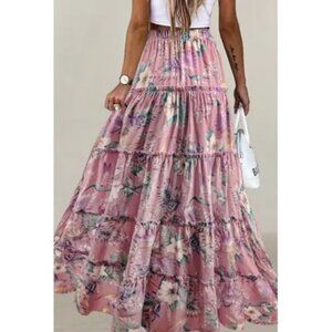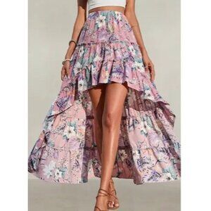 New Women's XL Pink Floral Tiered High Low Tropical Skirt Ruffle Boho BTFBM