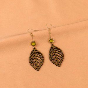 Wooden leaf earrings with green bead Alloy Lightweight 10g