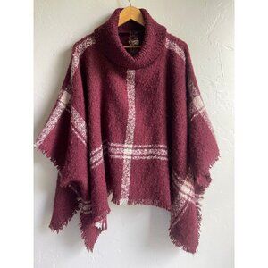 New! World Market Knit Turtleneck Poncho Red Cream Fringed One Size Cozy Soft