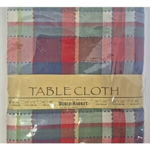 The World Market Plaid Red Green Blue Table Cloth is a stylish 54 inch square tablecloth made of cloth material. It features a red, green, and blue plaid pattern, adding a pop of color to any dining table. Perfect for adding a touch of whimsy and freshness to your dining room decor, this tablecloth is both functional and decorative. Upgrade your dining experience with this eye-catching and versatile tablecloth.