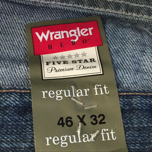 New with tags Men's Wrangler regular fit denim jeans, size 46 waist, 32 length regular fit.