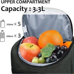 🧿DUAL COMPARTMENT DESIGN - The double decker design facilitates you to organize your food. You can store meal prep bento containers or sandwiches in the bottom layer, the top layer is more suitable for storing fruits or drinks. The interior dimensions of bottom /upper compartment is: 10.3 x 8 x 5.4 inches /10.3 x 8 x 4.6 inches (L x W