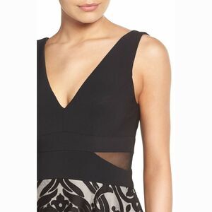 New! XSCAPE Women's Scroll Motif Illusion Cutout Dress V-Neck V-Back Black