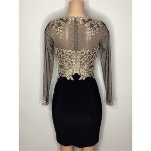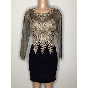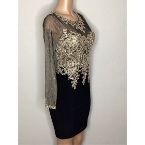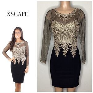 New. XSCAPE black evening dress with gold embroidered detail. Jewels scattered throughout. The black knit at the bottom part of the dress has a lot of stretch in it. The gold embroidered part stretches, but not as much due to the fabric. Sheer long sleeve. This is a gorgeous dress for any special occasion, Christmas party or wedding.