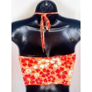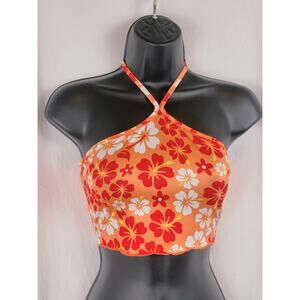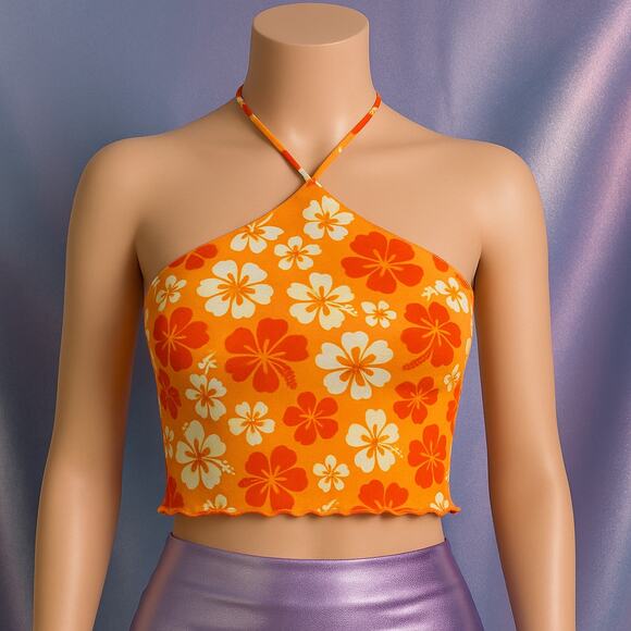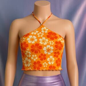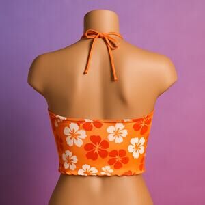 New Y2K Small Halter Top Beach Hibiscus Print Orange Tropical Lettuce Baackless