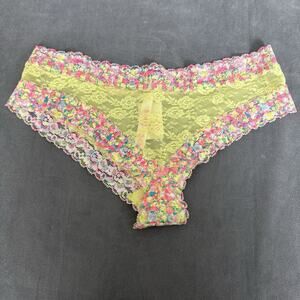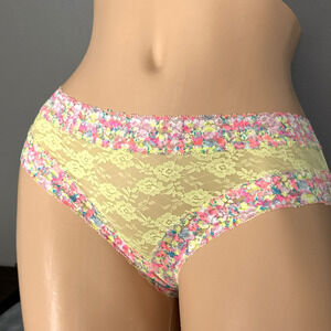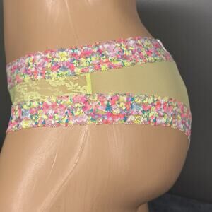 Listed is a y2k 2013 Victoria's Secret extra low rise cheekster panty, cheeky style partially see through lace front, bright yellow with neon floral lace accents, sheer mesh back.
