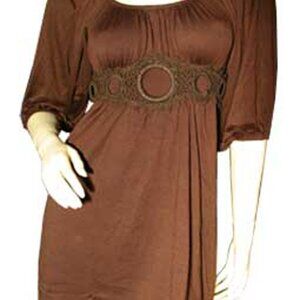 New, never been used/washed, womens choco/chocolate brown princess/goddess top blouse with square neck, empire waist, puff half sleeve - women's long tops or tunic tops. Has a crochet and O-ring details at front, and wide adjustable tie back waist strap. Soft and stretchy fabric. Fabric material is 60% Polyester, 32% Rayon, 8% Spandex. Womens tops great as casual wear, going out tops, etc. Hurry! We only have ONE PIECE of this item!