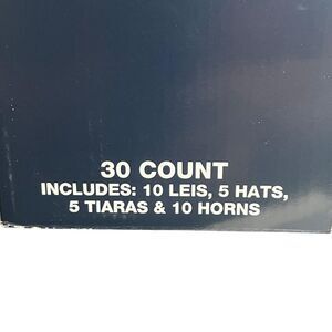 Includes: 10 leis, 5 cone hats, 5 tiaras and 10 horns, all with colorful metallic "Happy New Year" designs.